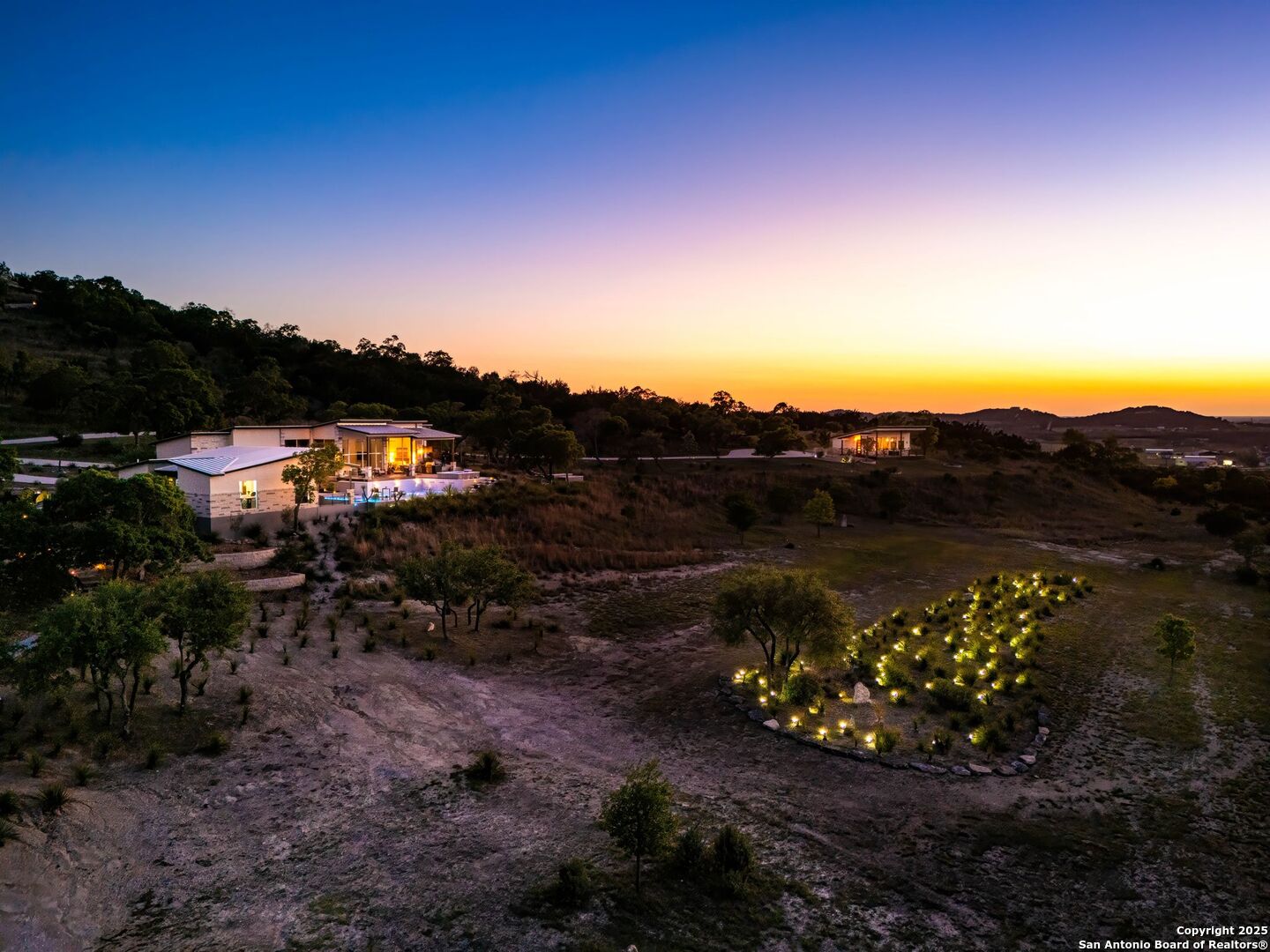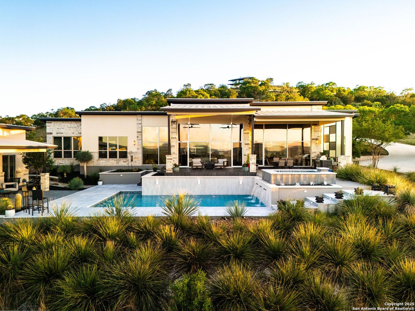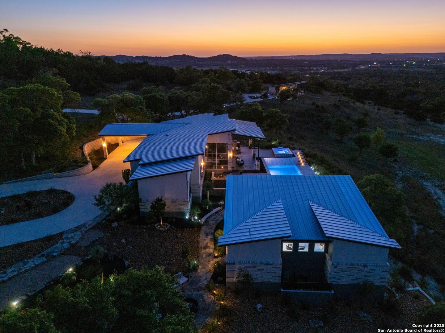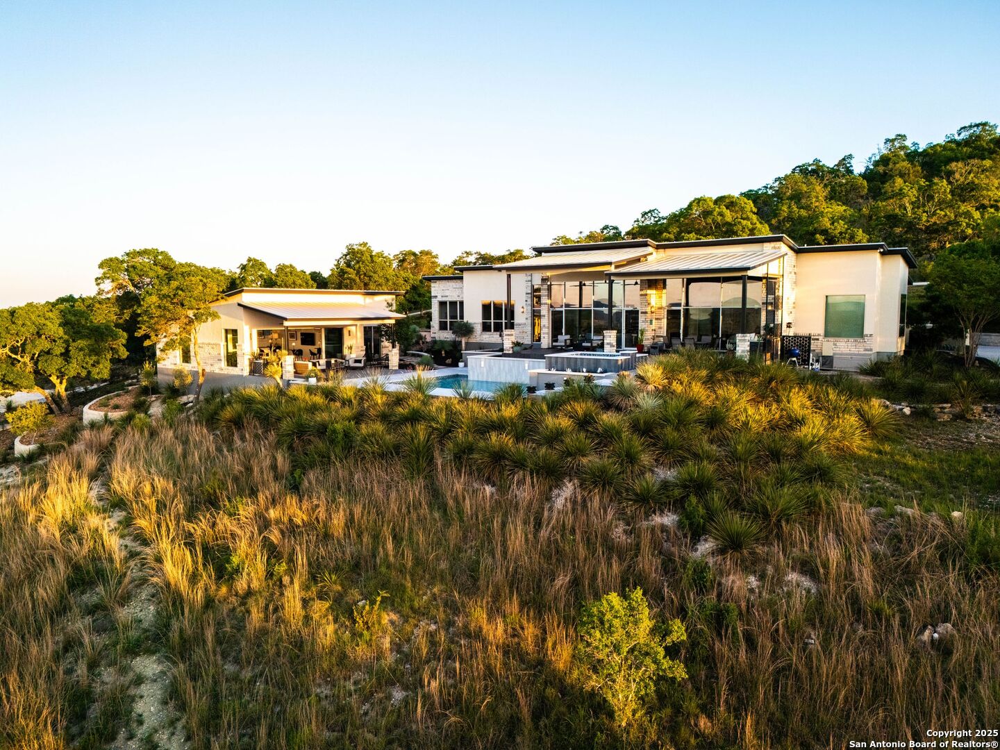 Experience unparalleled luxury in the heart of the Texas Hill Country with this exceptional modern ranchette estate, a true sanctuary that seamlessly blends nature's grandeur with refined elegance. Spanning over 12 private acres, this one-of-a-kind residence is perfectly situated just outside San Antonio in the charming town of Comfort, Texas. Nestled on the tranquil hillside at the rear of a gated estate, it offers unparalleled seclusion while still providing convenient access to city amenities and the San Antonio International Airport, making it ideal for both relaxation and effortless travel. Step inside to discover an expansive sanctuary where floor-to-ceiling windows frame breathtaking panoramic views of rolling hills and endless natural beauty, inviting the outdoors in. The thoughtfully curated interior merges natural stone accents with sophisticated textures, cultivating a warm yet modern ambiance throughout. Architectural mastery is evident in sleek, seamless lines that harmonize with the landscape, creating a perfect synergy between indoor and outdoor living. Floor plans designed for effortless entertaining boast spacious areas that open onto the sprawling outdoor terraces, where you can unwind by your luxurious pool or gather at the stylish Car Bar cabana-a vibrant setting for hosting friends and family. Imagine waking each day immersed in awe-inspiring vistas, with the rising sun casting a golden glow over your private paradise. From dawn to dusk, each moment offers a new perspective-an evolving masterpiece of natural beauty and refined comfort. For your guests, a private guesthouse provides an equally indulgent experience, ensuring everyone enjoys their stay in comfort and style. This estate is more than just a home-it's a lifestyle of exclusive luxury, serenity, and effortless elegance. Discover your new sanctuary in Comfort, where exceptional living begins and every moment is touched by beauty. Welcome to your Hill Country retreat-where nature and luxury unite in perfect harmony.